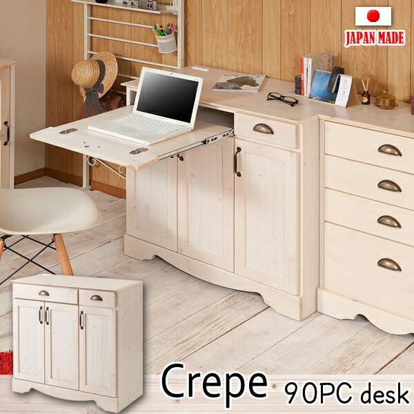 ホワイトカントリー【Crepe】クレープシリーズ 天然木パインFAX台兼用パソコンデスクキャビネット 幅90 木製 学習机 勉強机 デスク プリンター パソコンラック スリム キーボードテーブル付リビング収納 pcデスク スライドテーブル リビングデスク 引き出し おしゃれ