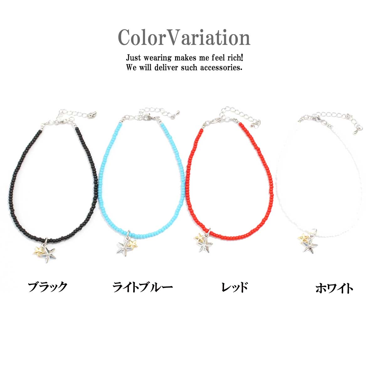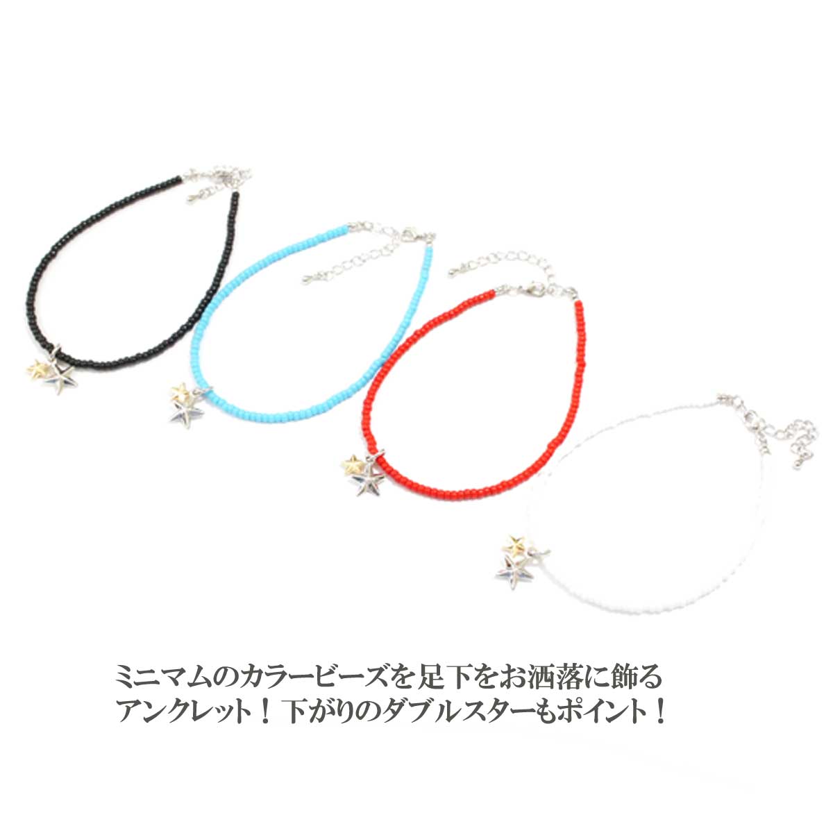 お洒落は足元から!アンクレットでワンランク上のコーデに!! カラーが足元をグッと引き締めるお洒落の春夏定番に新作ダブルスターアンクレット! 約3mmのカラービーズは肌カラーに目立つブラック、レッド、ライトブルー、ホワイトの4カラー チャームがスター、星!お洒落にシルバーとゴールドのコンビカラーが◎! 下がりスターチャームがキラッと輝きと動きを演出してくれます。