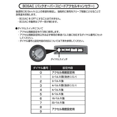 アクセルコントロールマネージャーは ・停止時及び徐行時(前進/後退10km/h未満)においてアクセルペダルが急激に踏み込まれた際にブザー音と同時にアクセルを制御し、急発進を抑制する機能(OAC) ・アクセルペダルとブレーキペダルが同時に踏み込まれた場合にブレーキ操作が優先される機能(BOS) ・後退時に約5km/h以上の車速を検知し、強制的に車両をクリープ現象にさせる機能(BOSAC) 上記3つの機能が備わった急発進抑制装置です。